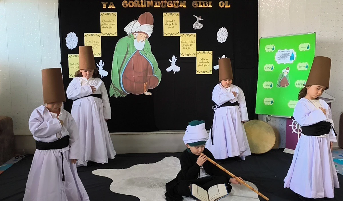 Anamur İlçe Müftülüğüne bağlı Değirmencik Burnu, Müberra Mert ve Yunus Emre 4-6 Yaş Kur’an Kursları tarafından düzenlenen etkinlikte minik öğrenciler, Mevlana’nın hoşgörü, sevgi ve birlik temalı öğretilerini yaşlarına uygun bir dille öğrendi.