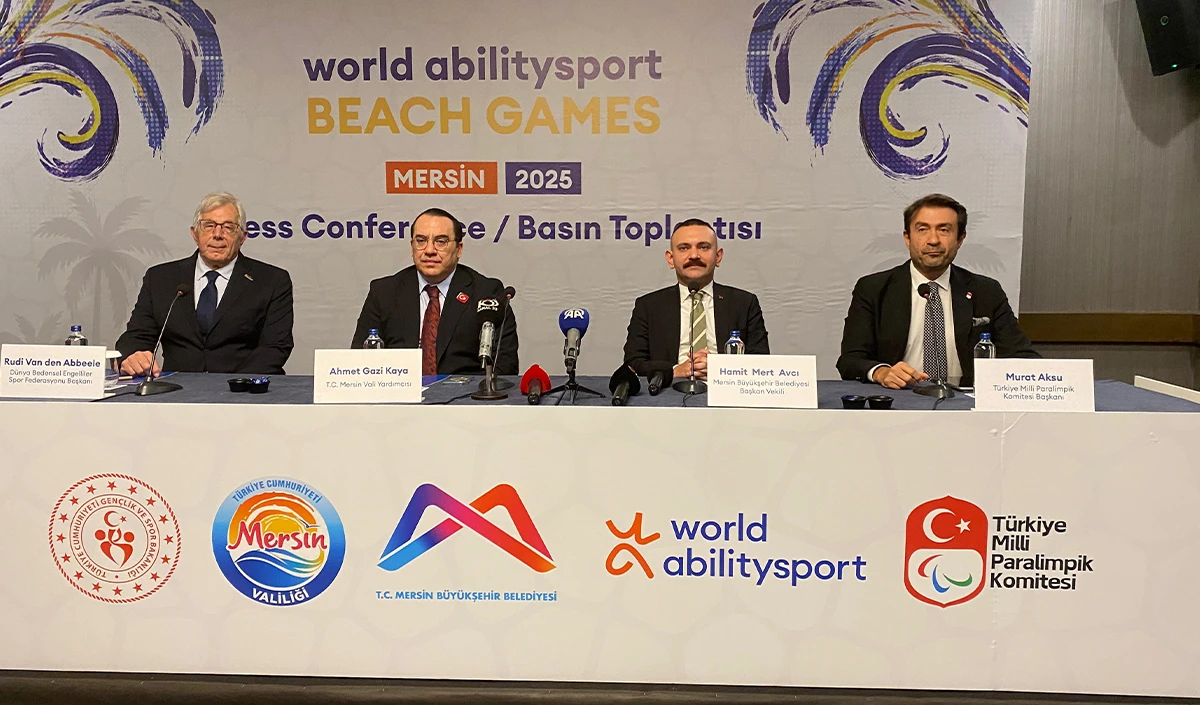 Türkiye Milli Paralimpik Komitesi (TMPK) tarafından, Dünya Bedensel Engelliler Federasyonu iş birliğiyle 18-25 Ekim 2025 tarihleri arasında düzenlenecek ‘Mersin 2025 Dünya Bedensel Engelliler Plaj Oyunları’nın basın toplantısı kentteki bir otelde gerçekleştirildi. Toplantıya Mersin Vali Yardımcısı Ahmet Gazi Kaya, Türkiye Milli Paralimpik Komitesi Başkanı Murat Aksu, Dünya Bedensel Engelliler Spor Federasyonu Başkanı Rudi Van den Abbeele ve Mersin Büyükşehir Belediye Başkan Vekili Hamit Mert Avcı katıldı.