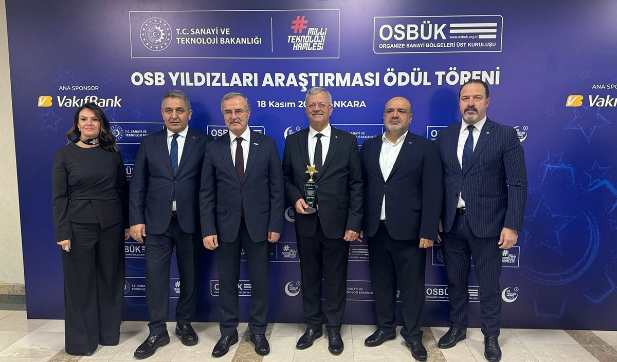 Organize Sanayi Bölgeleri Üst Kuruluşu (OSBÜK) tarafından bu yıl beşincisi düzenlenen OSB Yıldızları Araştırması Ödül Töreni, Ankara’da gerçekleştirildi. Törende Mersin OSB, "En çok katkı veren OSB' kategorisinde ödüle layık görüldü.