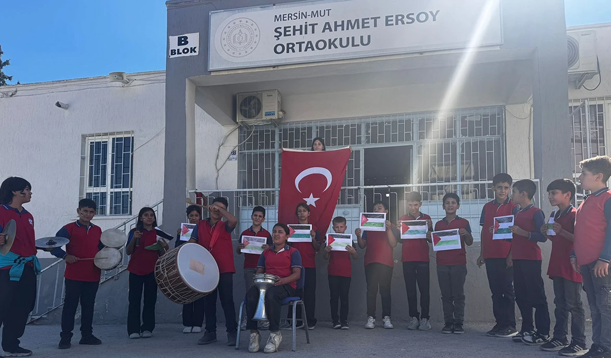 Mersin'in Mut ilçesinde ortaokulu öğrencileri, Filistin'e destek, Gazze'de yaşananlara dikkat çekmek amacıyla okul bahçesinde etkinlik yaptı.