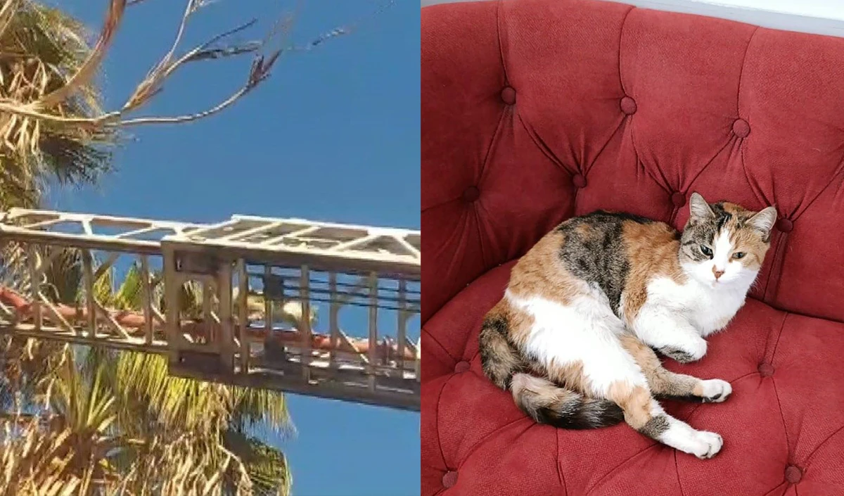 Palmiye ağacının tepesinde günlerdir mahsur kalan sokak kedisi, itfaiyenin uzattığı merdivenden yürüyerek indi