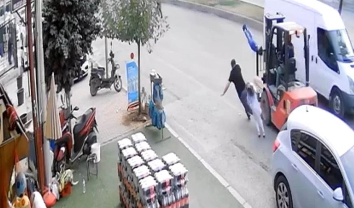 Mersin'de ters şeritten gelen forklift, yolun karşısına geçmeye çalışan baba ile iki çocuğuna çarptı. Kaza anı saniye saniye güvenlik kamerasına yansıdı.